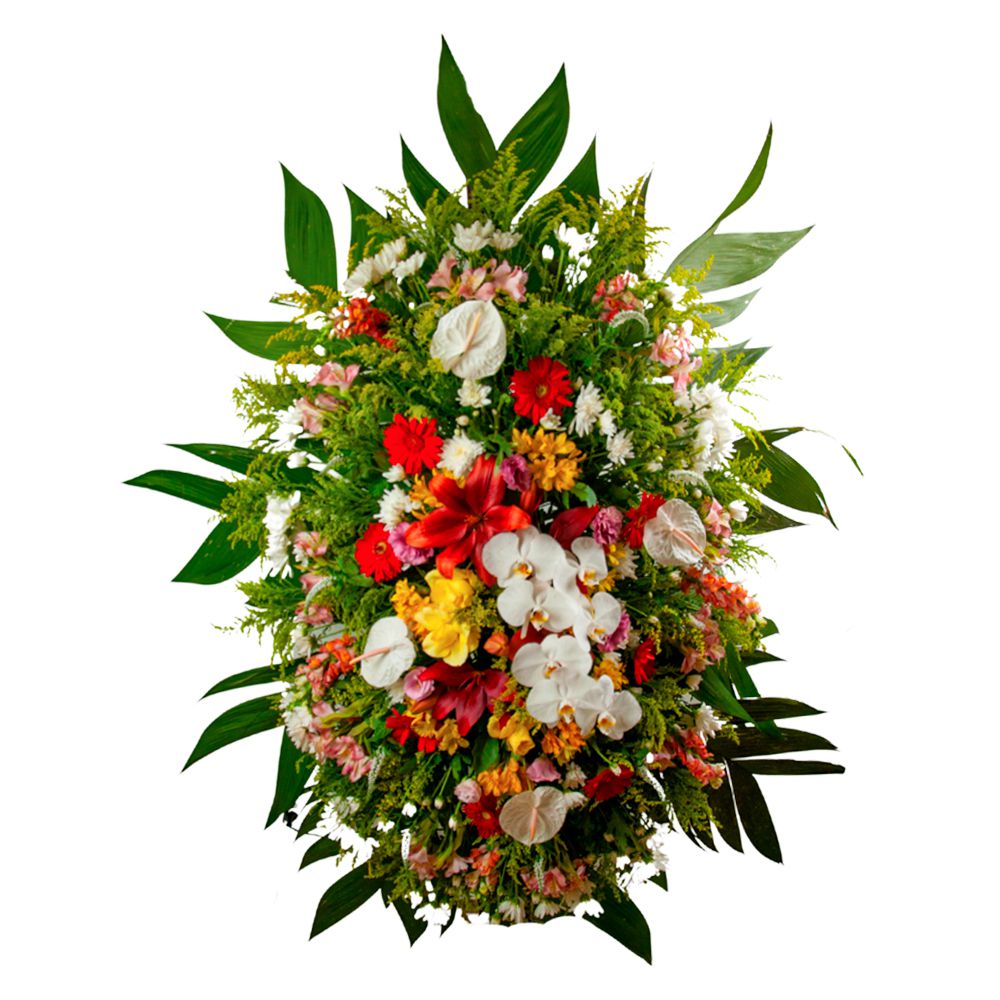Coroa fúnebre com flores do campo na medida aproximada de 1,70×1,20m com montagem principal em crisântemos e destaque em lírios, rosas e orquídeas. Checar disponibilidade de flores do dia.